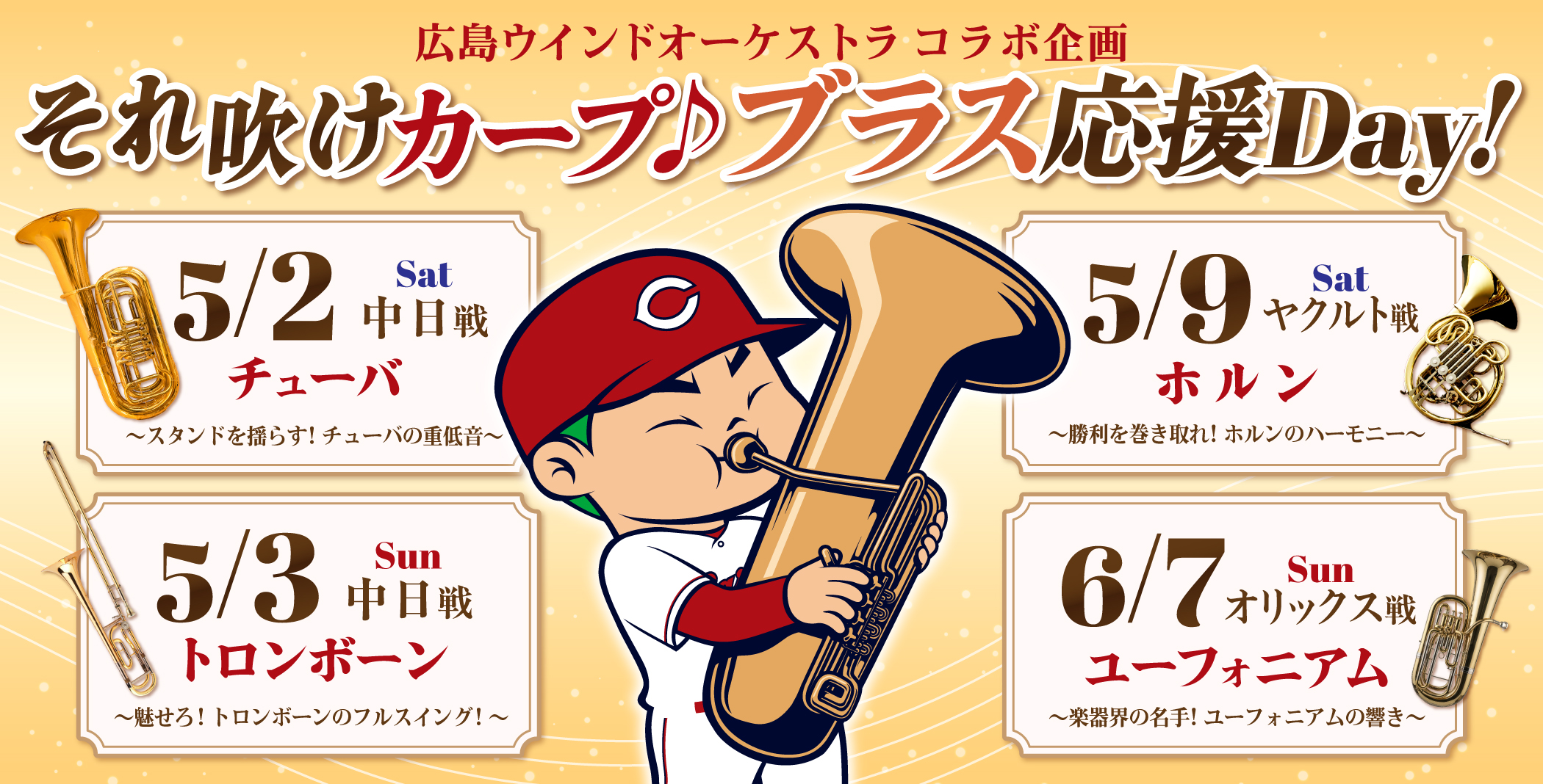 5月2日(土)、5月3日(日)の中日ドラゴンズ戦、5月9日(土)東京ヤクルトスワローズ戦、6月7日(日)オリックス・バファローズ戦にて、広島ウインドオーケストラコラボ企画「それ吹けカープ♪ブラス応援Day!」を開催いたします。